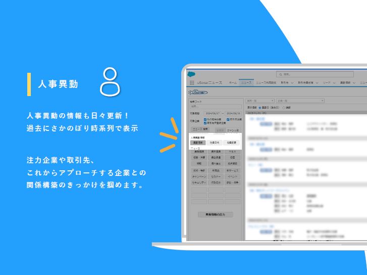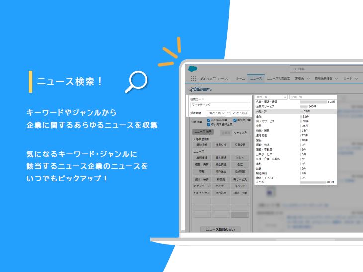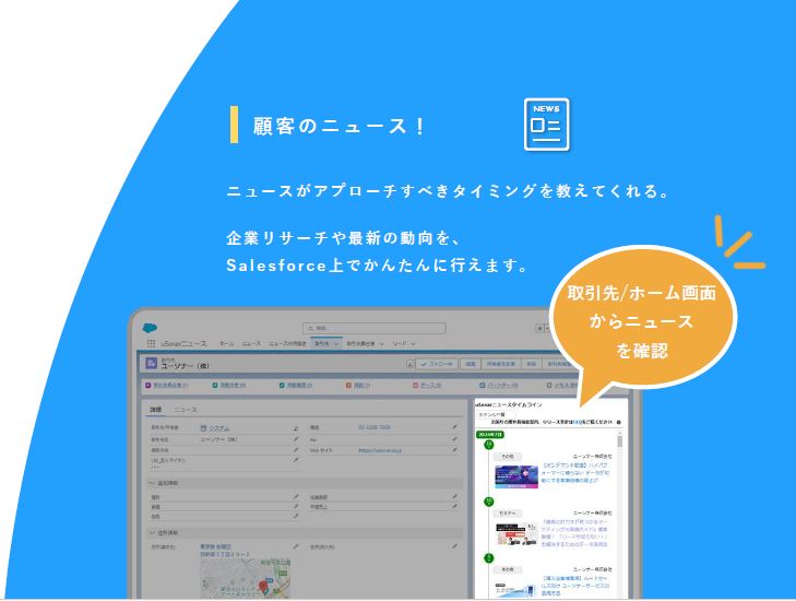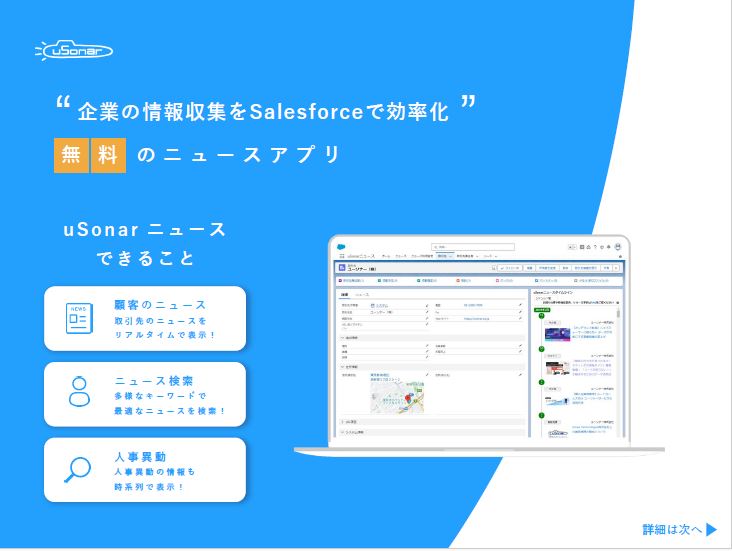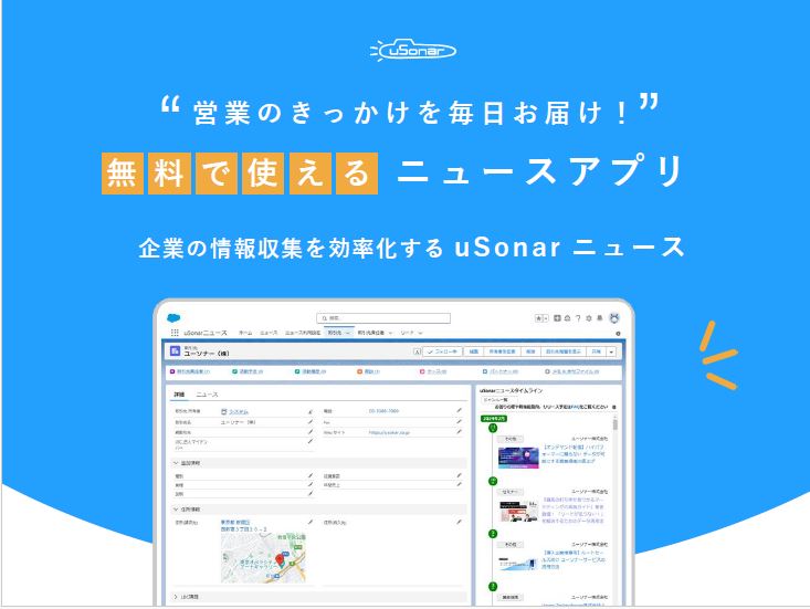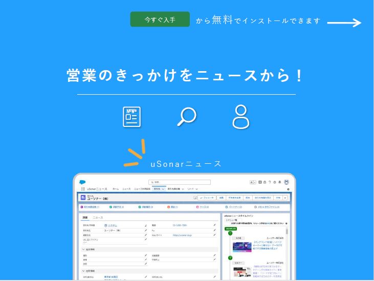 「ユーソナーニュース」は、法人企業に関するニュースをSalesforceへ連携します。##異動ニュースを含め、企業の最新動向、新サービスの発表など具体的な行動をとるきっかけ(コンペリングイベント)をタイムリーに収集できるため、タイムリーなセールス・マーケティングが実現できます。####【お問い合わせはコチラ】##usonar-news@usonar.co.jp####インストールに必要な資料は下記にございます。##https://go.usonar.co.jp/uSonarNews_InstallManual.pdf