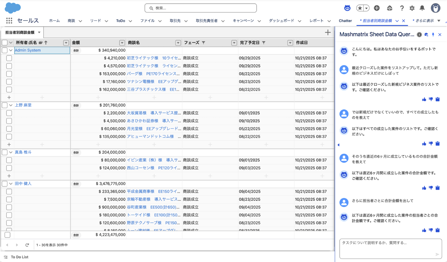 Agentforceエージェントに日本語の文章で指示するだけで、Salesforce内にあるデータを適切に抽出し、Mashmatrix Sheet のExcelのような画面で一覧表示